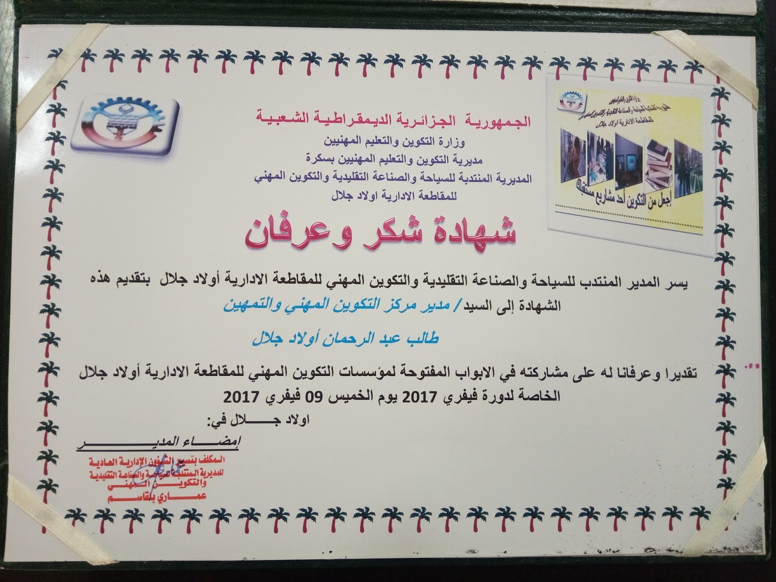 مركز التكوين المهني و التمهين طالب عبد الرحمان أولادجلال شهادة تقدير بمناسبة تنظيم الابواب المفتوحة على التكوين المهني يوم التاسع فيفري 2017